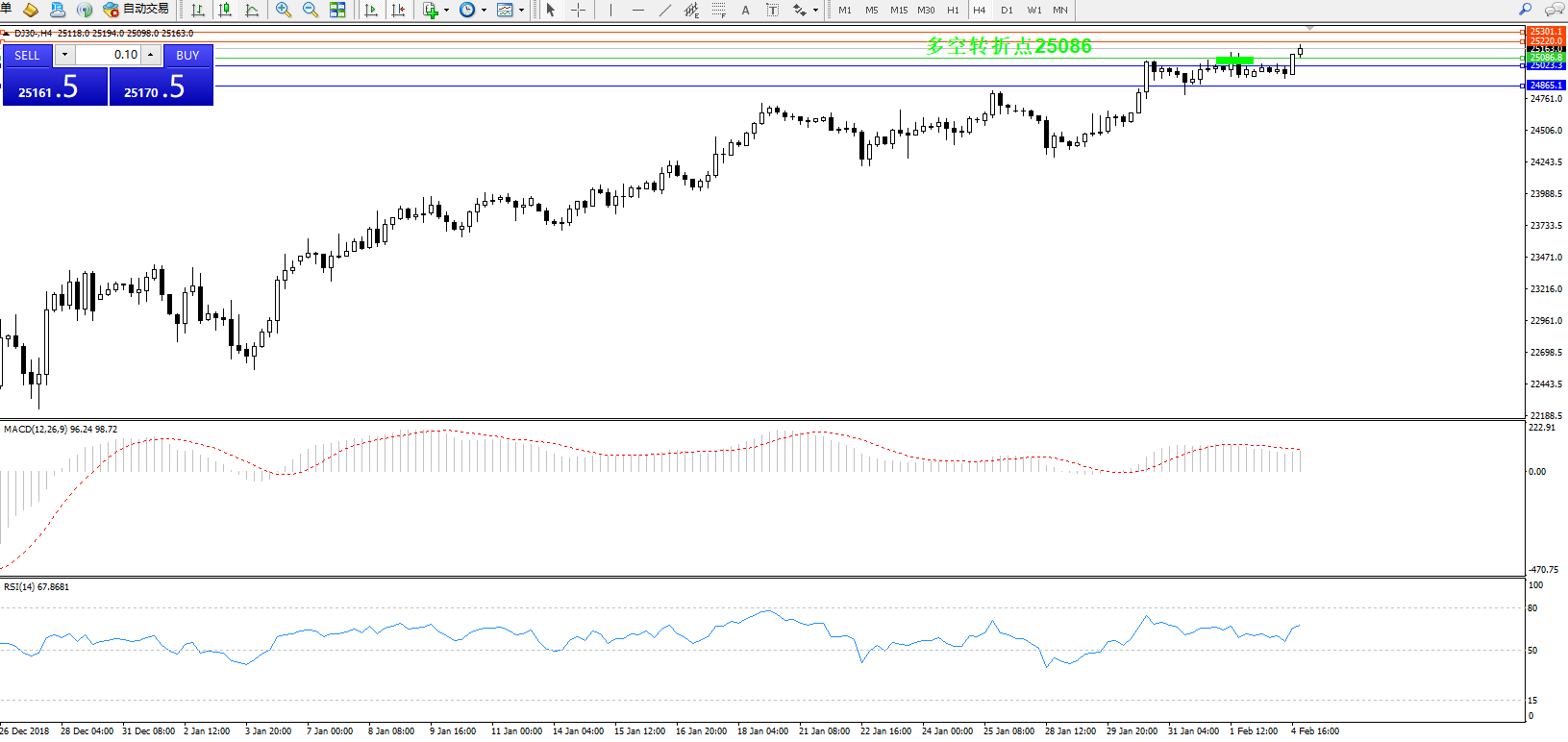 道琼斯指数DJ30—— 4小时K线图显示: