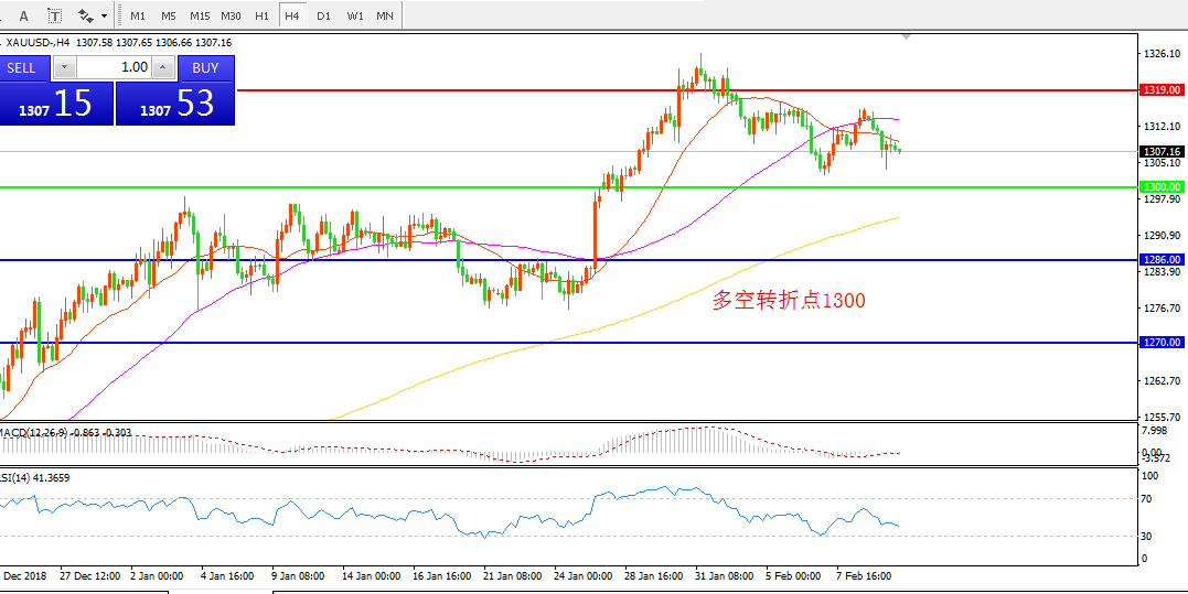 4小时图看,金价在均价形成死叉后震荡下行,形态上呈现高位整理均线出现拐头,,MACD绿柱缩短。日内重点关注1300一线支撑。